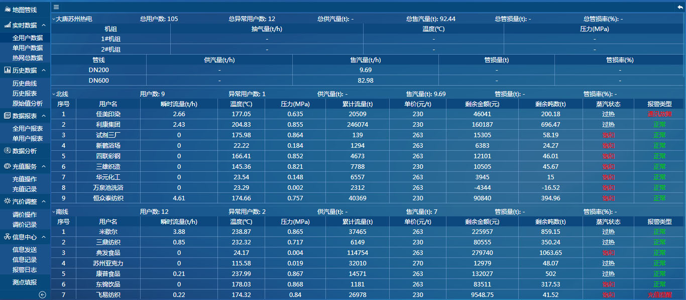 目前系統(tǒng)已開發(fā)有8大一級功能模塊(地圖管線、實時數(shù)據(jù)、歷史數(shù)據(jù)、數(shù)據(jù)報表、數(shù)據(jù)分析、充值服務、汽價調(diào)整、信息中心)17個二級功能模塊(熱網(wǎng)總數(shù)據(jù)、全用戶數(shù)據(jù)、單用戶數(shù)據(jù)、歷史曲線、歷史報表、原始值分析、全用戶報表、單用戶報表、充值操作、充值記錄、調(diào)價操作、調(diào)價記錄、信息發(fā)送、信息記錄、報警日志、測點填報、質(zhì)量報告)